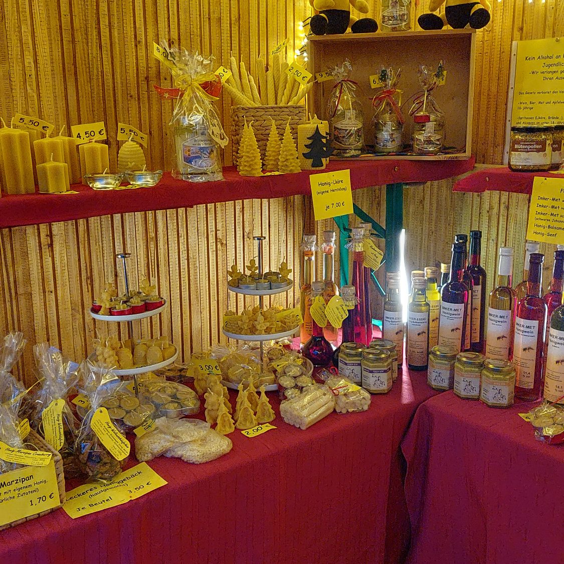 Neben unseren vielfältigen Honigsorten erhalten Sie bei uns weitere spannende Bienenprodukte wie Kerzen, Kosmetik oder Honig-Met.